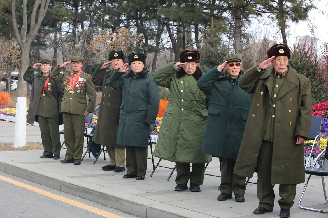 當護送志愿軍烈士遺骸棺槨的騎警車隊即將抵達沈陽抗美援朝烈士陵園時,幾位已過耄耋之年的志愿軍老戰(zhàn)士顫顫巍巍地從凳子上起身。他們舉起右手,一齊向迎面駛來的車隊敬禮。