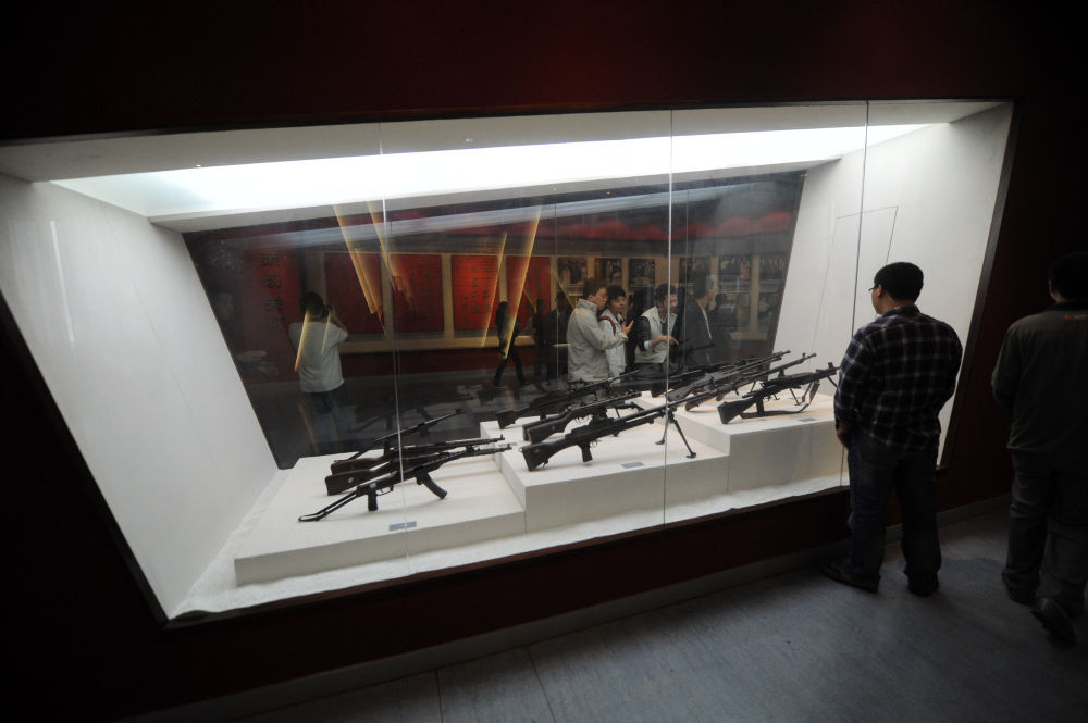 ↑ 觀眾在鹽城新四軍紀念館內(nèi)參觀槍支等實物展品(2011年5月26日攝)。