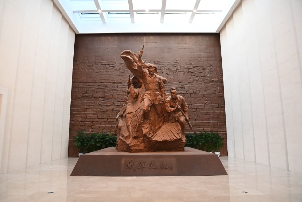 ↑鹽城新四軍紀念館內(nèi)陳列的雕像(2023年11月24日攝)。