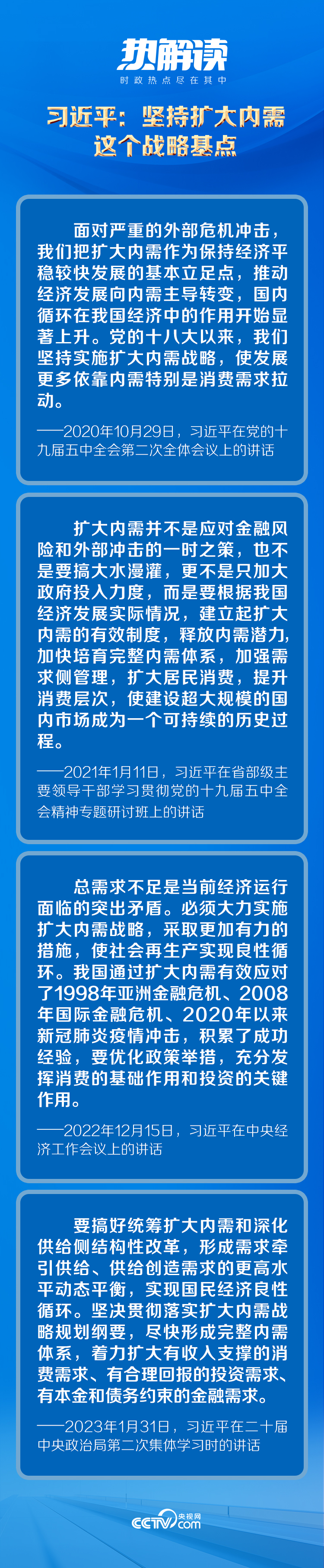 黨的十八大以來,習近平總書記從我國經(jīng)濟運行的實際出發(fā),對擴大內(nèi)需作出了一系列重要論述,為實施擴大內(nèi)需戰(zhàn)略提供了科學指引。