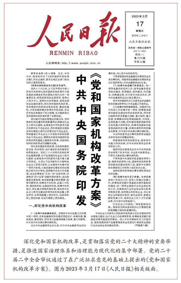 2023年2月,黨的二十屆二中全會(huì)審議通過(guò)《黨和國(guó)家機(jī)構(gòu)改革方案》,推動(dòng)黨對(duì)社會(huì)主義現(xiàn)代化建設(shè)的領(lǐng)導(dǎo)在機(jī)構(gòu)設(shè)置上更加科學(xué)、在職能配置上更加優(yōu)化、在體制機(jī)制上更加完善、在運(yùn)行管理上更加高效。