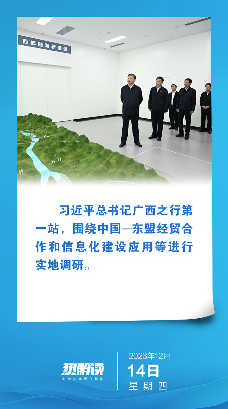 熱解讀12月14日,結(jié)束越南出訪回國(guó)后,習(xí)近平總書(shū)記在廣西考察。第一站,他走進(jìn)中國(guó)—東盟信息港股份有限公司,圍繞中國(guó)東盟經(jīng)貿(mào)合作和信息化建設(shè)應(yīng)用等進(jìn)行實(shí)地調(diào)研。