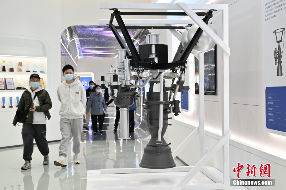 中科空天飛行科技產(chǎn)業(yè)化基地在廣州南沙投產(chǎn)。圖為中科空天飛行科技產(chǎn)業(yè)化基地展廳展示的液體發(fā)動機(jī)模型吸引參觀者。 中新社記者 陳楚紅 攝