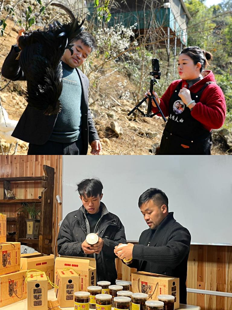 上圖:2月2日,袁彬(左)在烏骨雞莊園進(jìn)行直播。(陸志秋 攝)下圖:2月6日,袁彬(右)在查看烏骨雞產(chǎn)品。(袁思云 攝)