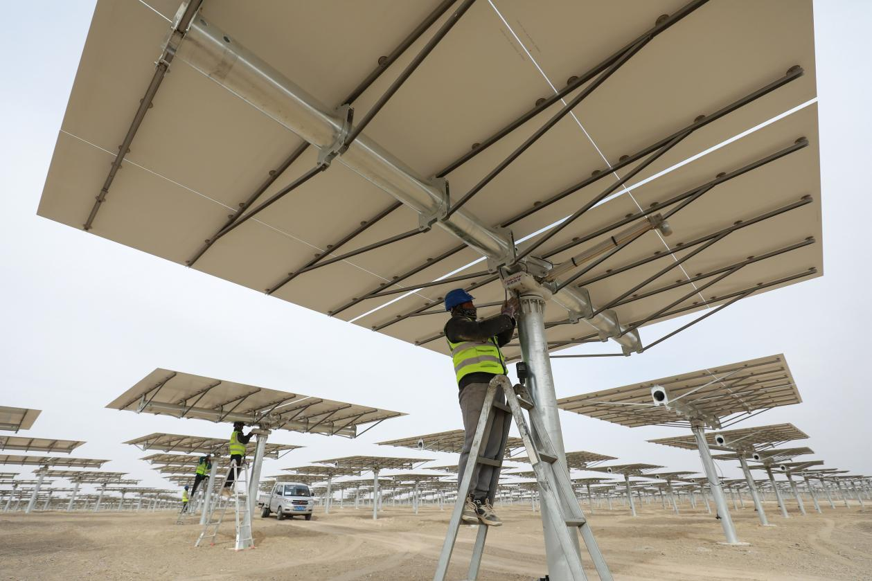 △ 2024年3月12日,甘肅省酒泉市金塔中光太陽能10萬千瓦光熱+60萬千瓦光伏項(xiàng)目現(xiàn)場,施工人員有序作業(yè)。