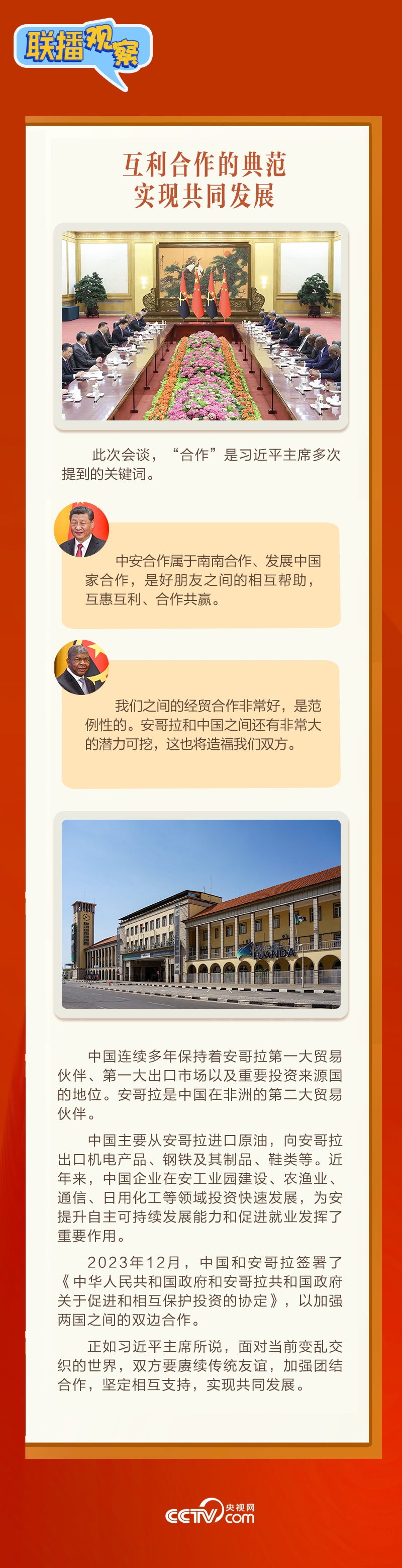聯(lián)播+3月15日,習近平主席在人民大會堂同來華進行國事訪問的安哥拉總統(tǒng)洛倫索舉行會談。會談中,習主席稱洛倫索總統(tǒng)為“中國人民的老朋友”,評價中安關系“歷經(jīng)國際風云變幻考驗,實實在在造福了兩國人民”。