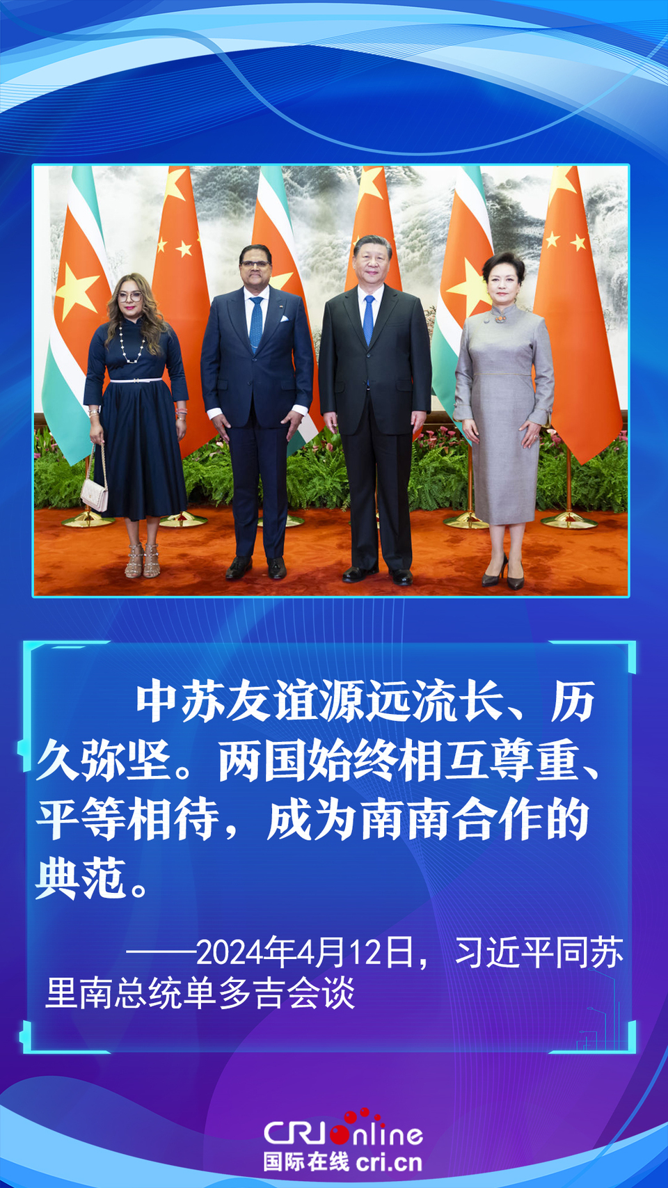 今年是中國和蘇里南建立戰(zhàn)略合作伙伴關系五周年。習近平主席在會談中以“源遠流長、歷久彌堅”為中蘇友誼增添了新的注解,為推動構建更加緊密的中蘇戰(zhàn)略合作伙伴關系指明了方向。