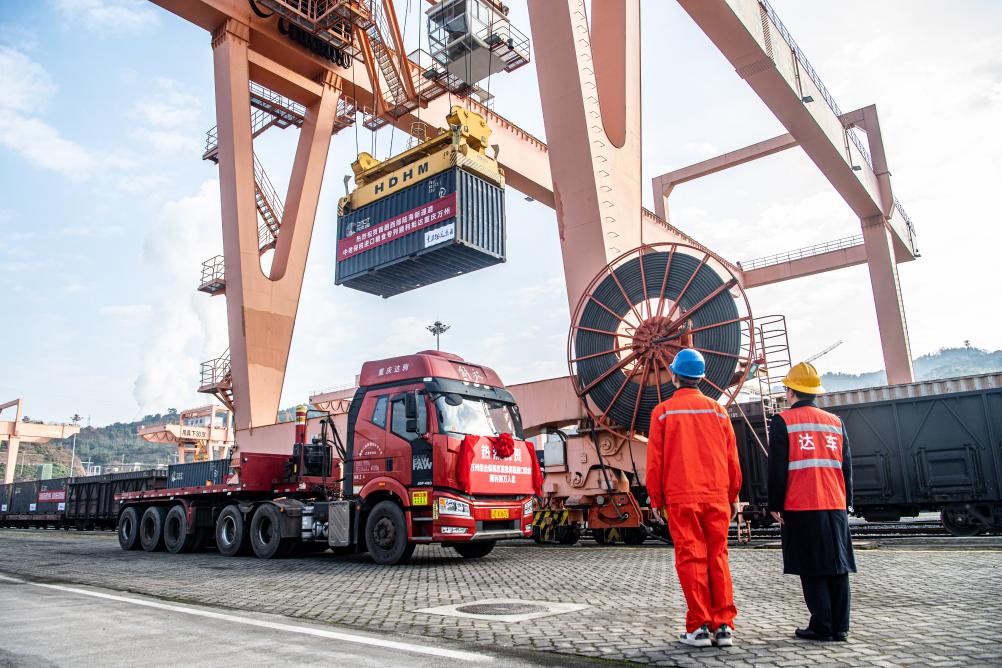 ??1月4日,在重慶萬(wàn)州新田港站,工作人員進(jìn)行集裝箱吊裝作業(yè),將專列貨物轉(zhuǎn)運(yùn)至公路物流環(huán)節(jié)。新華社記者 唐奕 攝
