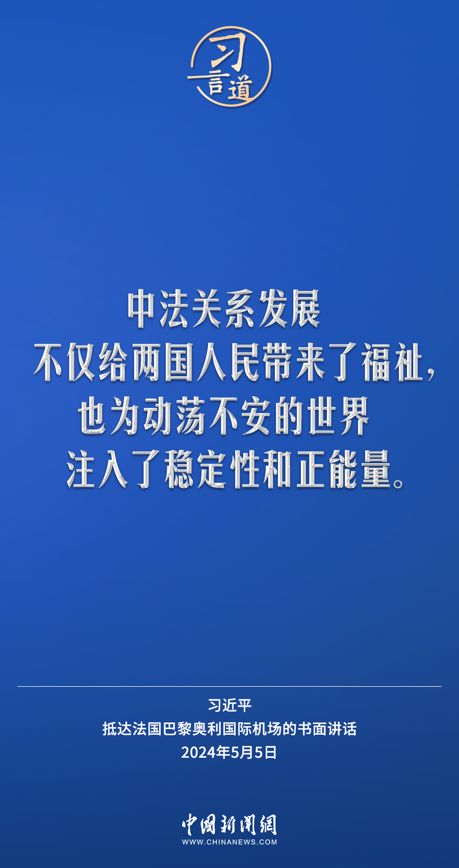 當?shù)貢r間5月5日下午,國家主席習近平抵達巴黎,開始對法國進行國事訪問。在抵達法國巴黎奧利國際機場的書面講話中,習近平指出——