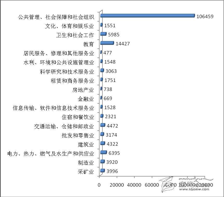 在法人單位從業(yè)人員中,位居前三位的行業(yè)是:公共管理、社會保障和社會組織106459人,占63.64 %;教育14427人,占8.62%;電力、熱力、燃氣及水生產(chǎn)和供應(yīng)業(yè)6395人,占3.82 %。在有證照個體經(jīng)營戶從業(yè)人員中,位居前三位的行業(yè)是:批發(fā)和零售業(yè)14883人,占39.66 %;住宿和餐飲業(yè)9014人,占24.02 %;交通運輸、倉儲和郵政業(yè)8226人,占21.92 %(詳見表1-4)。