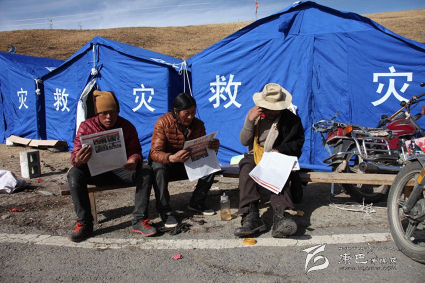 康定地震發(fā)生以來,前往災(zāi)區(qū)采訪的記者堅(jiān)持向?yàn)?zāi)區(qū)群眾帶去《甘孜日報(bào)》藏漢文報(bào),讓群眾在安置點(diǎn)就能了解黨委、政府組織抗震救災(zāi)的情況。圖為江巴村民正在救災(zāi)帳篷外看報(bào)。 李慶林 攝影報(bào)道