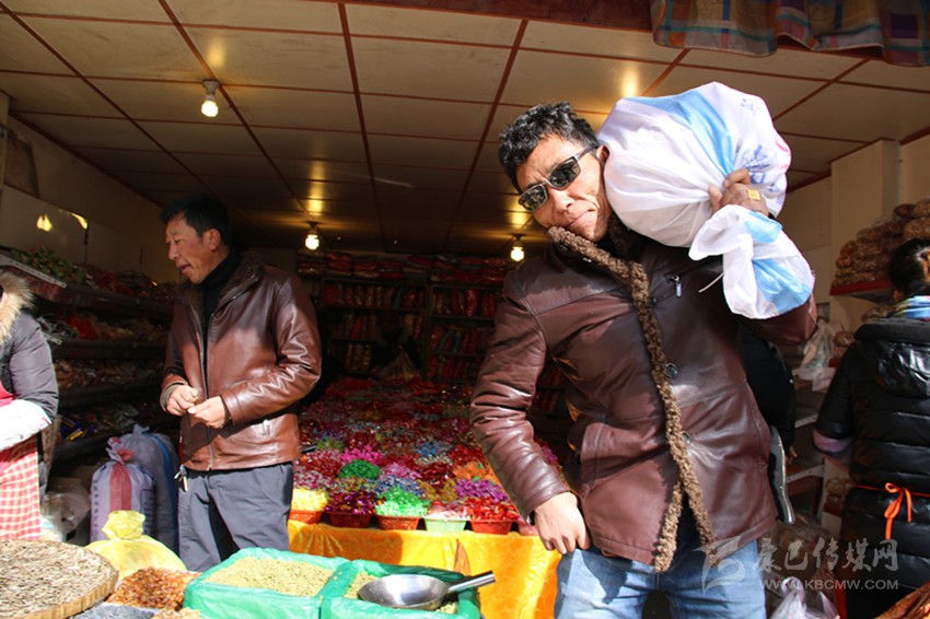 走進(jìn)郭達(dá)橋重康糖果店,洛讓說:“多買點(diǎn)糖果糕點(diǎn),娃娃老婆喜歡?!比缓笳諉吸c(diǎn)貨:花生10斤、瓜子5斤、葡萄干5斤、水果糖5斤、軟糖5斤、炒米糖10斤……一下就指點(diǎn)了八九種糖果糕點(diǎn)。看到了這樣的生意,老板樂開了花。與洛讓大包大攬的氣派不同,長期經(jīng)商的扎西老練地詢價(jià):“老板,我們買這么多,要優(yōu)惠喲。”一番討價(jià)還價(jià)之后,洛讓和扎西買了十種糖果,用去1066元,裝滿整整兩編織袋。洛讓把糖果過扛在肩上,對筆者說:“你來試一下,有點(diǎn)分量,你別說,辦年貨也是一種體力活喲?!?/p>