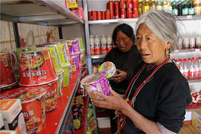 貨架上的貨物琳瑯滿目,價格與縣城大超市一分不差,還節(jié)省了路途奔波。“家門口就能買到東西,還又好又便宜,安逸。開展精準(zhǔn)扶貧,硬是為大家解決了大困難。” 村民格瑪拉措道出了村民們的感激。大家共同商議決定把這超市叫做“洛蝦村感恩超市”。
