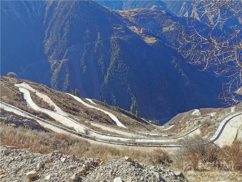 然布村山頂,住著包括白馬青珠和嘠絨多吉家在內(nèi)的14戶藏族老鄉(xiāng)。以前,從海拔3000米的山腳,到海拔4000米的山頂家里,只有一條一米左右寬的羊腸小道。下山一個(gè)來回,路上就要花一整天。山高路險(xiǎn)、交通不便,許多村民一年都難得下山一趟。遇上需要修房運(yùn)送木材等,靠著人拉馬馱,來來回回,光運(yùn)輸就要耽擱大半個(gè)月時(shí)間。
