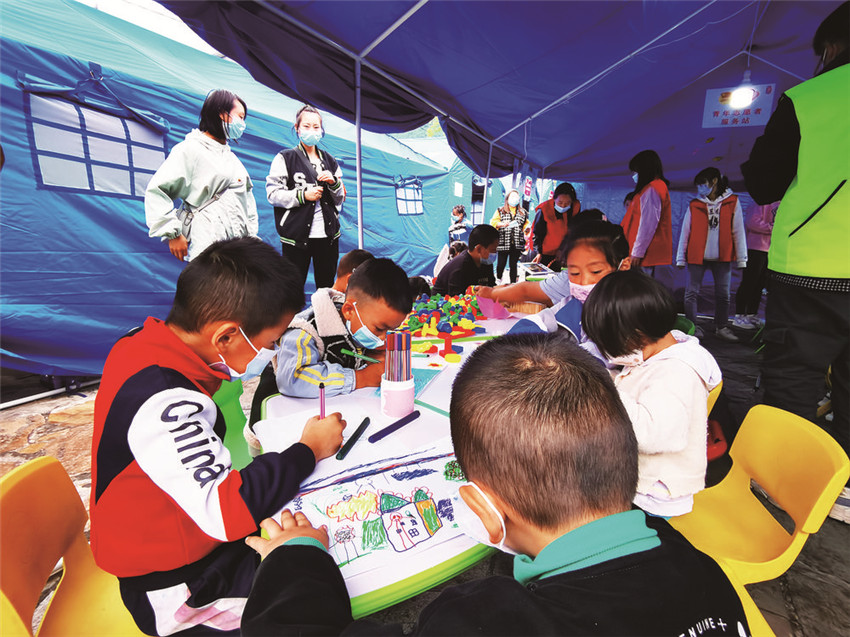 “這頂帳篷中充滿了孩子們的歡聲笑語,這在地震災(zāi)區(qū)就是最動聽的聲音?!惫睬鄨F(tuán)甘孜州委統(tǒng)戰(zhàn)社會聯(lián)絡(luò)部部長澤仁娜姆介紹,地震發(fā)生后,團(tuán)州委第一時間組織3193名志愿者,24支青年突擊隊參與應(yīng)急志愿者工作,并在磨西鎮(zhèn)貢嘎廣場分配38名志愿者參與后勤保障工作,其中5個人便成為了“青青兒童樂園”里的“保育員”,“孩子們可以在這里畫畫、做游戲,還能在老師輔導(dǎo)下學(xué)習(xí),他們不安的情緒也得到安撫,臉上的恐懼也逐漸被微笑取代?!?/p>