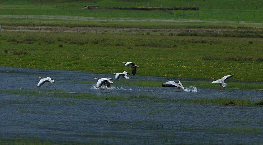 斑頭雁在白玉縣藍(lán)松湖上“飛舞”。 風(fēng)語(yǔ) 攝
