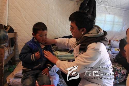 在新都橋鎮(zhèn)東俄洛三村的一頂救災(zāi)帳篷里,來自“雅安市抗震救災(zāi)醫(yī)療救援小組石棉分隊”的石棉縣人民醫(yī)院內(nèi)科醫(yī)生李登豐正在給當(dāng)?shù)貎和恋嵌嗉獧z查身體。土登多吉的母親說孩子這兩天感冒了,經(jīng)過檢查,李登豐發(fā)現(xiàn)土登多吉并未發(fā)燒,只是扁桃體有點發(fā)炎,于是趕緊讓同行的護(hù)理人員拿來了治療感冒和消炎的藥物。