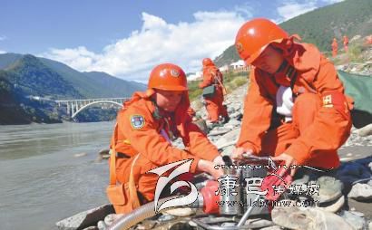圖為徐驊(右)和戰(zhàn)士在架設水泵準備滅火。  (武警四川省森林總隊甘孜州支隊供圖)