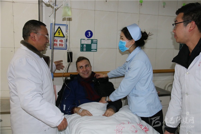 和國(guó)醫(yī)生正在給臨床病人檢查病情。一位來康定玩的俄羅斯小伙因患重感冒住進(jìn)了急救中心。正在輸液的他用比較熟練的中文激動(dòng)地告訴記者:“這里的醫(yī)生服務(wù)很好,他們過年都沒有休息,我得了重感冒,經(jīng)過治療以及在他們的細(xì)心關(guān)照下,我的病情好多了?!?/span>