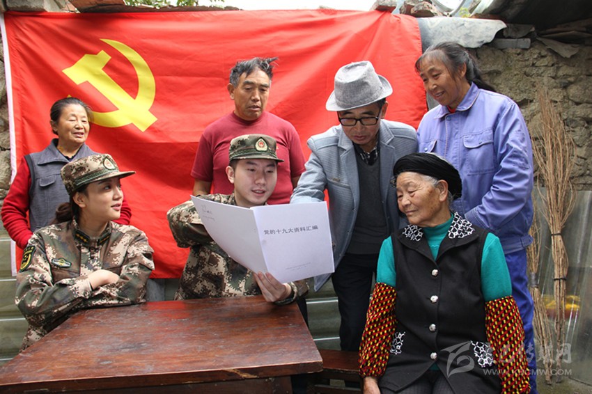宣傳小分隊(duì)來(lái)到瀘定縣田壩鄉(xiāng)田壩村崗崗組,給村民送上黨的十九大精神宣傳資料和報(bào)刊,與大家拉家常,耐心解讀黨的十九大精神。筆者在現(xiàn)場(chǎng)看到,村民們認(rèn)真閱讀報(bào)紙并聆聽(tīng)宣傳小分隊(duì)的講解。當(dāng)?shù)弥?xí)總書(shū)記在報(bào)告中提出“增進(jìn)民生福祉是發(fā)展的根本目的,必須多謀民生之利、多解民生之憂(yōu),在發(fā)展中補(bǔ)齊民生短板、促進(jìn)社會(huì)公平正義”時(shí),該村77歲的老黨員李如瓊拉著官兵的手激動(dòng)地說(shuō):“在黨的好政策引領(lǐng)下,我們過(guò)好日子的信心更足了。”