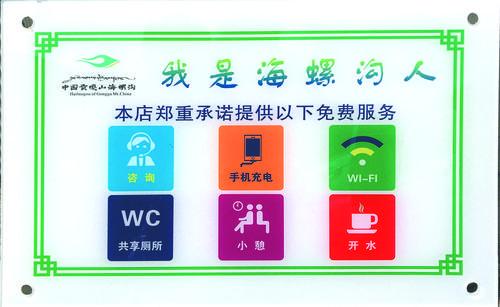 “我們長(zhǎng)征大酒店在提高服務(wù)質(zhì)量的同時(shí)也掛了這個(gè)牌子,我們承諾為客人提供免費(fèi)的開(kāi)水、充電、共享廁所等服務(wù),讓客人對(duì)海螺溝有一個(gè)美好的印象,在海螺溝過(guò)的開(kāi)心愉快。”長(zhǎng)征大酒店負(fù)責(zé)人楊德黎說(shuō)。
