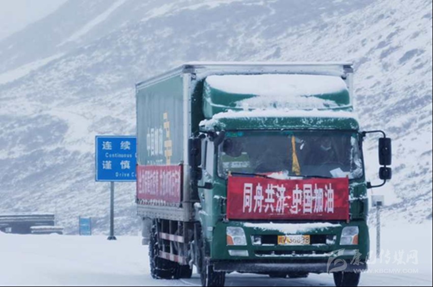 圖為甘孜郵政頂風冒雪逆行為八美鎮(zhèn)運送防疫物資。