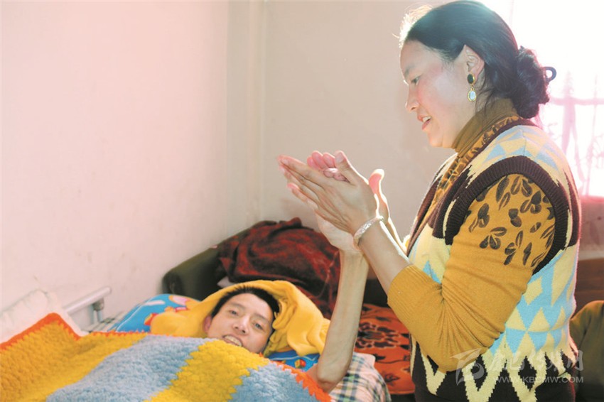 因為根絨的意外事故,家里沒有了經(jīng)濟(jì)來源。巨大的經(jīng)濟(jì)壓力,讓白措喘不過氣來。但她沒有向命運(yùn)低頭,撫育3個孩子,就近務(wù)工掙錢補(bǔ)貼家用。同時,利用工作間隙回家,照顧丈夫吃飯,給他翻身,換洗沾滿屎尿的墊布……因為擔(dān)心丈夫久臥生褥瘡和肌肉萎縮,白措每隔3小時就要給丈夫翻身,還自學(xué)了一套按摩手法替根絨全身按摩。在她的精心照料下,根絨身體慢慢得到了康復(fù)。