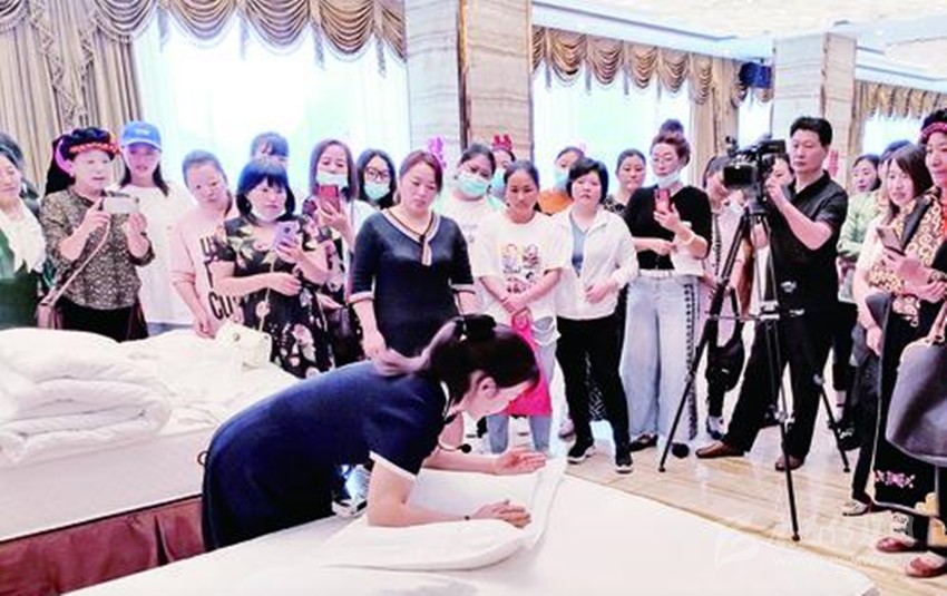 先檢查床箱與床墊是否吻合,床墊拉出40公分,鋪床前撣去床上毛發(fā),接下來開始甩單,床單正面朝上,床單中線居中,兩邊吊邊均等,甩單動(dòng)作簡(jiǎn)單瀟灑,準(zhǔn)確到位。這是7月8日,稻城縣文旅行業(yè)從業(yè)人員培訓(xùn)會(huì)上,筆者見到學(xué)員在教師的指導(dǎo)下表演的精彩一幕。