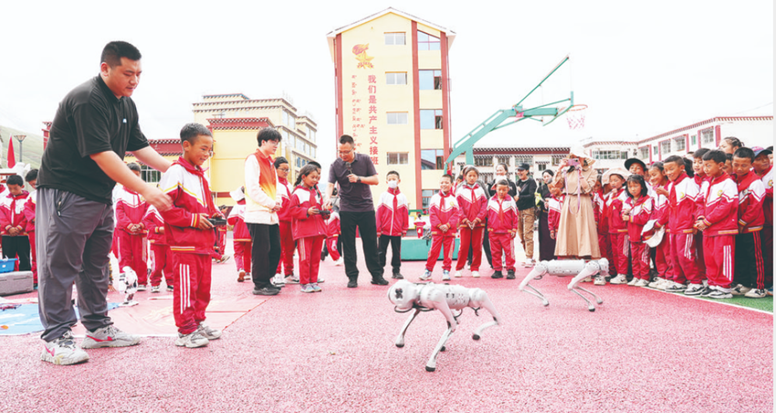 老師指導(dǎo)學(xué)生操作機器狗。