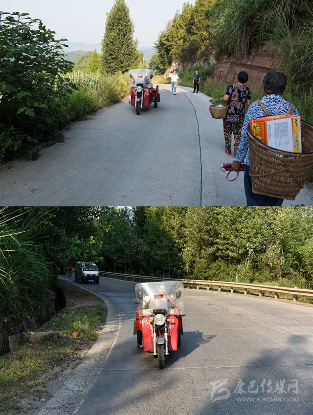 8月15日清晨,周強善在前往集市趕場的路上。攝影 張可凡