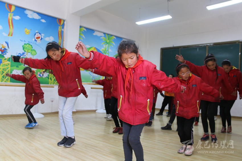 “要跟隨節(jié)拍,注意動(dòng)作協(xié)調(diào)連貫,舞蹈是非常愉悅的享受,要面帶微笑,動(dòng)作不要太僵硬。”在舞蹈室,老師正耐心地糾正孩子們的舞蹈動(dòng)作。老師是縣文化館的專業(yè)演員,成為學(xué)校的舞蹈老師后,她就負(fù)責(zé)全校的舞蹈教學(xué)工作。