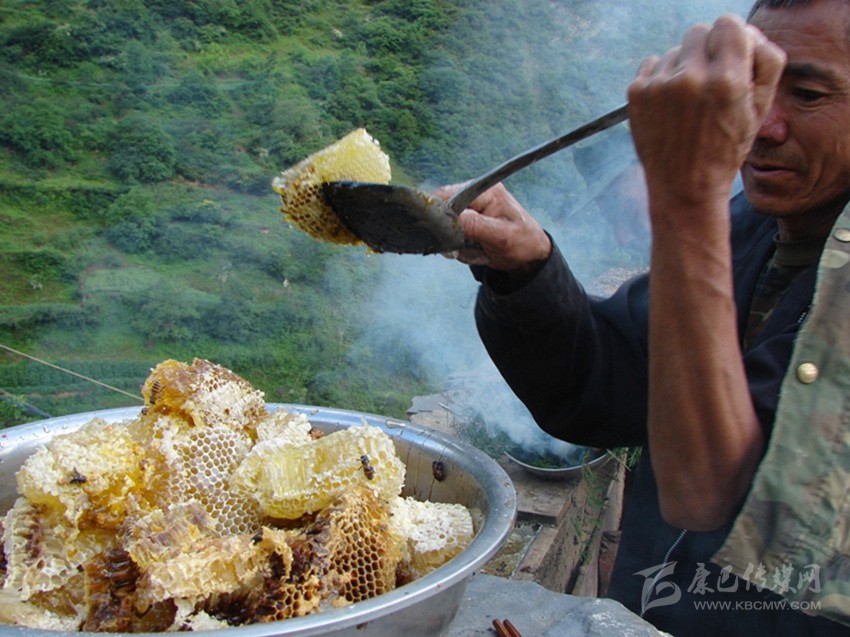 這時候,一位城里人開著車來到他家里,前來購買蜂蜜。蘭友才提著火爐,在里面撒上柏樹枝椏,打開蜂箱蓋子后,將煙霧吹進(jìn)蜂箱里。不一會兒,蜜蜂們紛紛飛出巢穴,在幾十米開外不停的飛翔、徘徊,只留下滿箱雪白的蜂蠟一排排整齊的豎立在那里。蘭友才拿出一把刀,輕輕地在蜂蠟上割取,并迅速將浸滿琥珀色糖液的蜂蠟放進(jìn)瓷盆里。蘭友才告訴我,蜂蠟的上半部分為蜂蜜,下半部分是蜂蛹的巢穴,因此只割取上半部分。