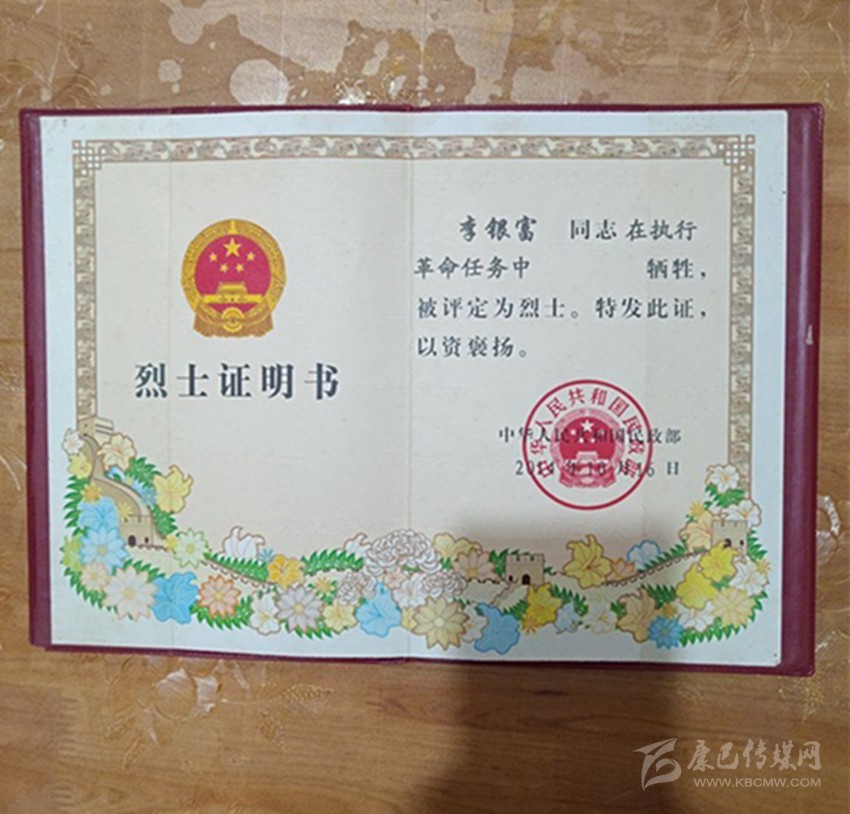 李銀富烈士的烈士證明書。