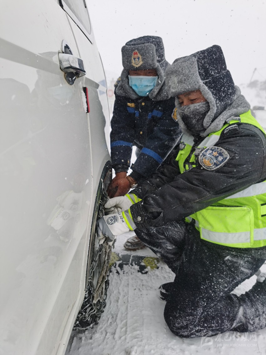 圖為錯(cuò)阿卡點(diǎn)民警幫助過往車輛安裝防滑鏈。