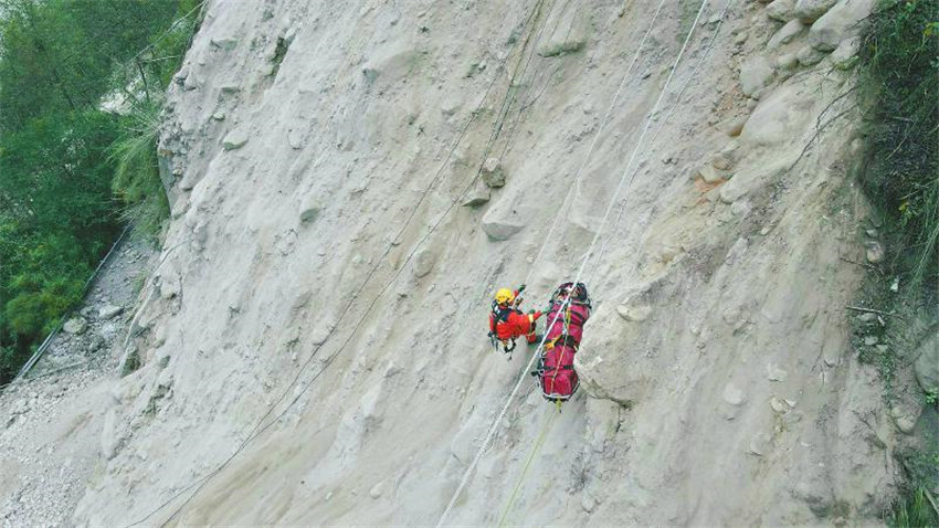 9月7日18時許,救援人員從海螺溝景區(qū)將一位受傷群眾用擔(dān)架運(yùn)出。因景區(qū)通往磨西鎮(zhèn)的主干道還在搶通中,救援人員采取吊繩、拖拉的方式,將受傷群眾從斷道處向上運(yùn)送到落差一百多米的安全處,再由等候的救護(hù)車運(yùn)送至醫(yī)療點(diǎn)。四川日報全媒體記者 吳聃 攝