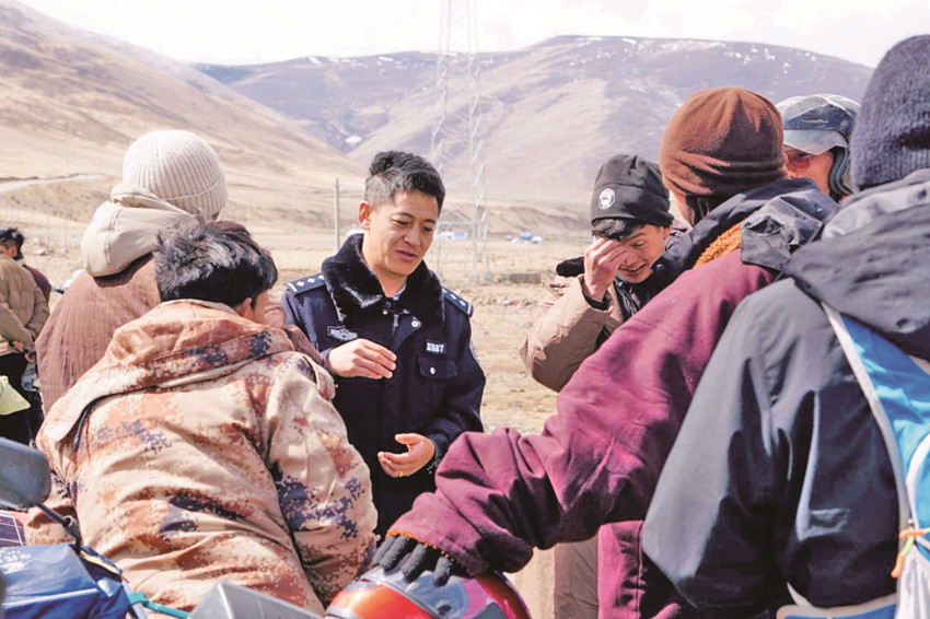 陽光明媚、警旗飄揚,一支小有規(guī)模的蟲草采集隊伍在警車的帶領(lǐng)下有序地在山路上前行。此時,滿面滄桑但雙眼炯炯有神的派出所所長丁真桑登談及這些年伴隨式服務(wù)蟲草山時深有感觸,言語間說到最多的就是責(zé)任?!皬睦硖琳{(diào)到新龍,我已連續(xù)三年駐守蟲草山,因為我是土生土長的‘理塘娃’,對這里相對要熟悉些,群眾遇到困難事、碰到麻煩事,解決起來要方便很多……”只言片語間,不經(jīng)意提及家人時,這位剛在群眾面前還笑容滿面的康巴小伙,露出了一絲牽掛與愧疚。原來,前不久,妻子在色威鄉(xiāng)衛(wèi)生院工作期間不慎摔倒,致腰椎骨折,丁真桑登只陪護了妻子10多天,便因為蟲草季,告別臥床療養(yǎng)的妻子,返回工作崗位。