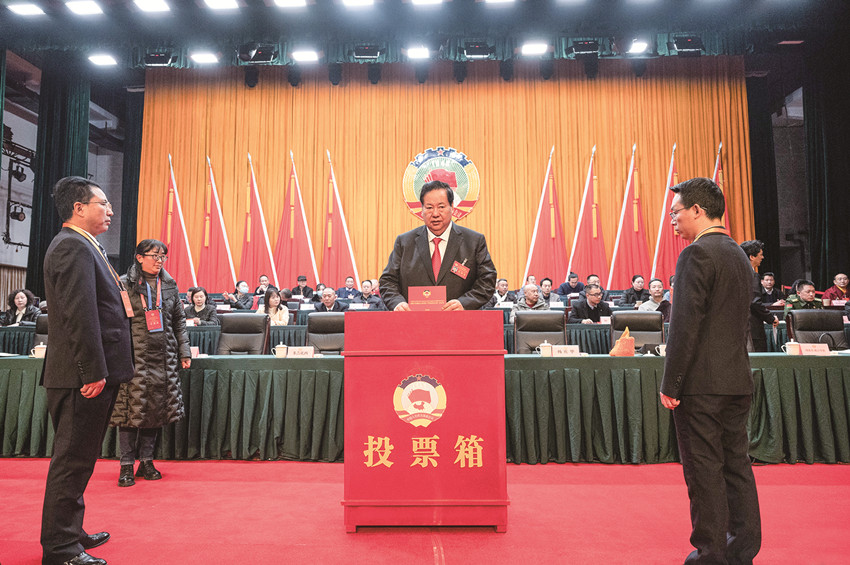 州政協(xié)委員在選舉大會上投下莊嚴的一票。