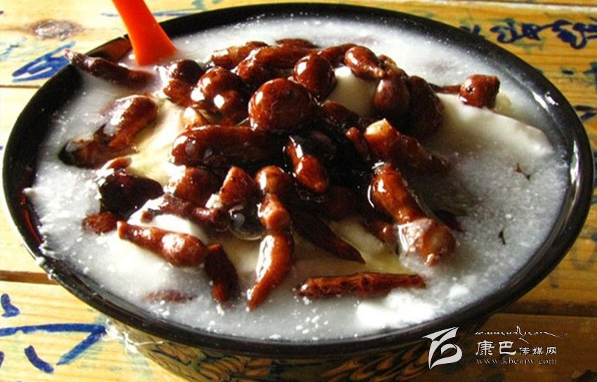 人參果飯也叫“卓瑪折絲”。將人參果煮熟后,放在米飯上面,細細地撒些白糖,再均勻地淋上一勺滾燙的酥油汁,一份營養(yǎng)又好吃的人參果飯就做好了。人參果飯被藏族同胞視為一種吉祥的食物,只在婚禮、節(jié)日食之,以之待客,視為尊貴之意。在隆重的藏歷新年,人參果飯會被盛在一個小巧精致的盛器內(nèi),供于佛龕前。