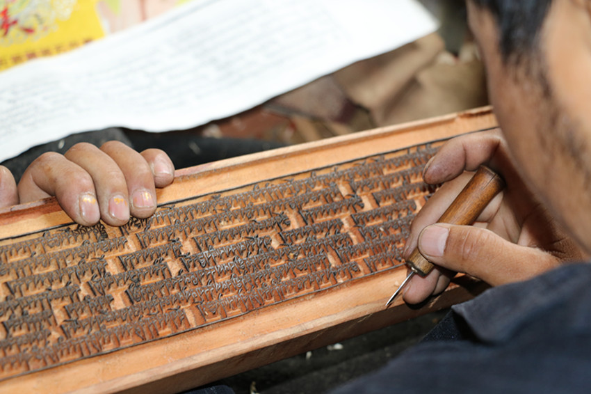 彭措澤仁現(xiàn)在的主要工作是核對(duì)、修復(fù),幾千塊有破損、錯(cuò)字或被老鼠咬壞的印版,經(jīng)他手得以復(fù)原。每完成一塊,彭措澤仁都會(huì)雙手將印版高舉過頭,閉目許愿。這是“敬畏之心”。